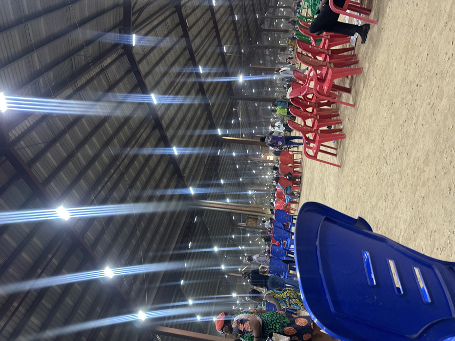 This image depicts a large indoor gathering space in Shagamu, Nigeria, characterized by a high corrugated metal roof structure supported by exposed dark beams