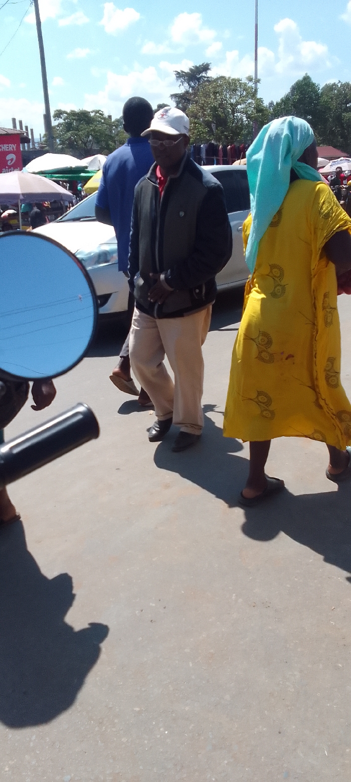 street scene in Kakunga, Kenya (latitude: 0.376, longitude: 34.853). Three people are walking in the street, a man in a blue shirt, a man wearing a dark jacket and white cap, and a woman wearing a yellow dress and a turquoise headscarf. The men are walking in the same direction, while the woman is walking towards the opposite direction. The man in the blue shirt is walking in front of the other man. The man in the dark jacket and white cap is walking behind the man in blue shirt. There is a silver car parked on the right side of the image. There is a blue sky with white clouds in the background. The street is paved and the pavement is rough. There is a pole on the left side of the image. There are trees and other buildings visible in the distance. There are some market stalls on the left side of the image. There is a large blue circular mirror on the left side of the image. The image is taken from a low angle.