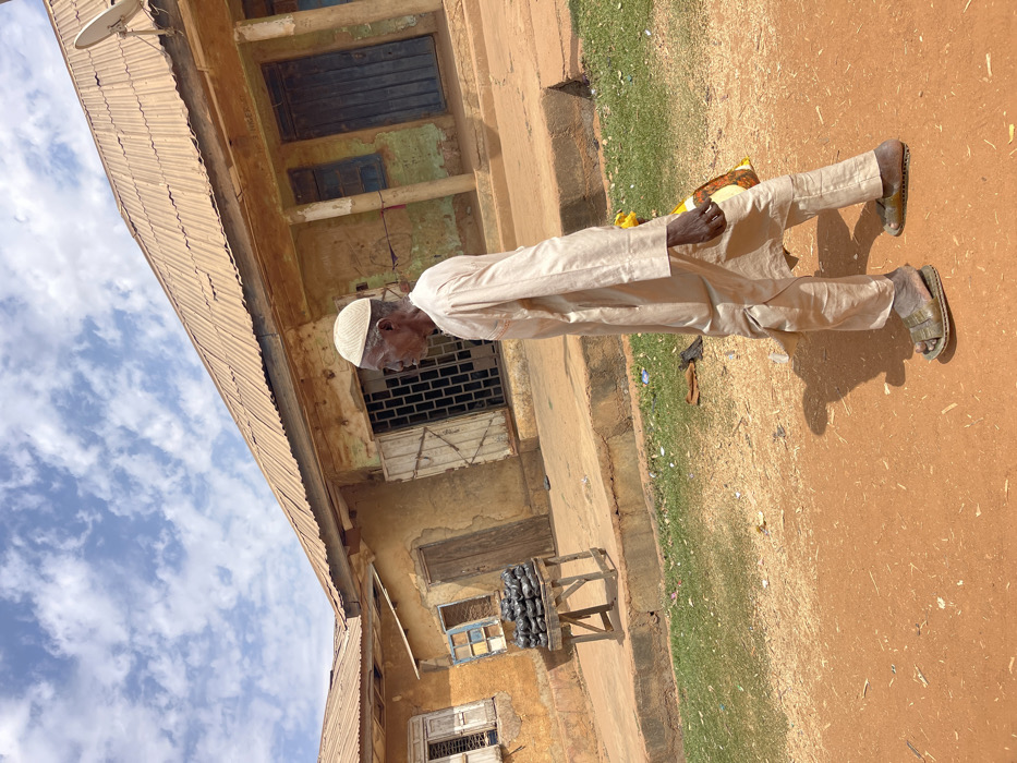 An elderly male individual, with dark skin, walks in profile from right to left across a reddish-brown unpaved road in Unguwar Gabas, Nigeria