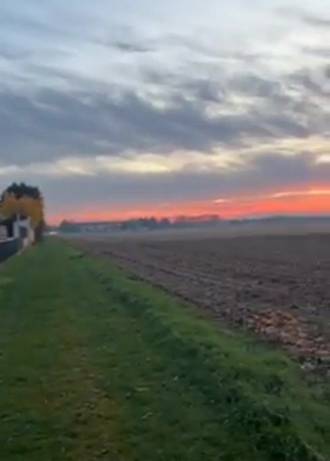 The camera pans across a landscape at sunrise or sunset. To the left is a fence, with a grass verge running along the edge of the field. The field is a dark, plowed soil with fallen leaves scattered across it. In the distance, the horizon glows with orange and red hues, while the sky is covered with wispy grey clouds. The light is soft and diffused, creating a peaceful, rural scene.