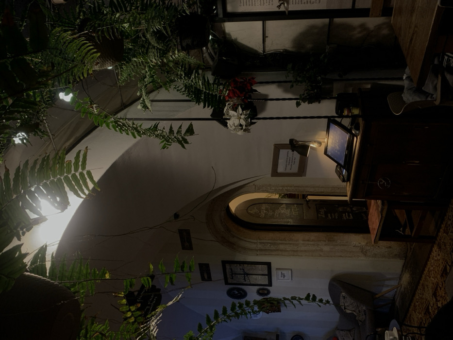 This image depicts the dimly lit interior of a commercial establishment, specifically **Kawiarnia Literacka (Literary Cafe)**, located at ul. Floriańska 43, 31-019 Kraków, Poland. The scene is characterized by historic stone architecture, including a prominent, ornate stone archway leading to another area, and a vaulted ceiling, all painted in light cream or white. Numerous lush green ferns and other plants are suspended from the ceiling in dark planters and cascade downwards, creating a verdant canopy. Additional potted plants are positioned on the right side of the frame. In the foreground, slightly to the right of center, a dark wooden counter or cabinet serves as a service station. A black electronic screen, likely a point-of-sale system, is positioned on its surface, angled towards the viewer. A task lamp with a metallic shade and an exposed Edison-style incandescent bulb illuminates this counter. To the immediate left of the counter, a dark wooden stool with a reddish-brown cushioned seat is placed. The impressive stone archway, central to the image, frames a dark door which appears to be functioning as a blackboard, covered with white chalk writing, possibly a menu or specials. Beyond this doorway, an illuminated space is visible. To the left of the archway, a wall displays several framed items of varying sizes, including one larger rectangular piece with a graphic design and a smaller, circular decorative object. Further left, part of a grey upholstered chair or small sofa with wooden legs is visible, indicating a seating area. A small, round table with a white cup and saucer is partially visible in the far lower-left corner. The floor is covered with a dark patterned rug or carpet. On the far right, dark metal structures support more plants and feature decorative elements, including artificial white and red floral arrangements. Portions of a wooden table and chairs are visible, suggesting additional seating in that section. Multiple exposed light bulbs embedded in the ceiling illuminate the arched architecture and foliage from above, contributing to the establishment's warm, ambient lighting. No people are present in the scene.