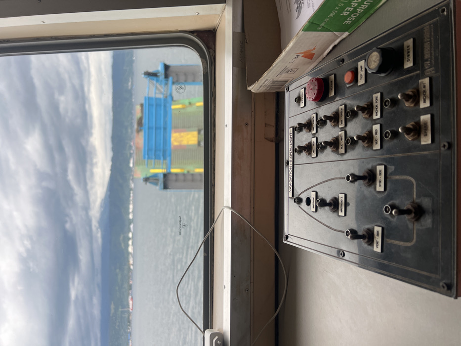The image depicts an interior view from a vessel, looking out a rectangular window at a maritime scene in Unknown, Indonesia. In the immediate foreground, a dark grey control panel, labeled "NAVIGATION / SIGNAL LIGHT," occupies the lower half of the frame. This panel features numerous toggle switches, some labeled "MASTHEAD 1," "MASTHEAD 2," "PORT - SIDE," "STRB - SIDE," "MUC - RED," "MUC - GREEN," "MUC - WHT," "ANCHOR FORE," "SPARK," and "MOORING." It also includes a prominent red circular "ALARM" button, an orange "TEST LAMP" button, and a black rotary "DIMMER" knob. To the right of the panel, a partial cardboard box, possibly for paper, is visible. A white power adapter and a grey cable rest on the window sill. Beyond the window, a body of water extends to the horizon. In the midground, a large, rectangular, multi-colored structure, possibly a barge or a movable ferry ramp with blue, green, and yellow sections, floats on the water. In the distant midground, a coastline with various small white structures and a few red vessels is visible along the water's edge. The background features large, undulating mountains or hills covered in dark green foliage, rising beneath a heavily overcast sky filled with dense grey clouds. No individuals are present.