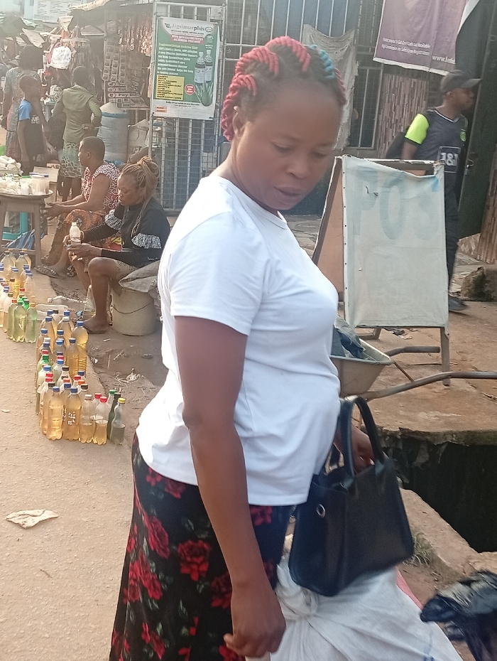 This image depicts a bustling outdoor market scene in Umuode, Nigeria. In the immediate foreground, a woman of African descent is captured in profile, facing slightly right and looking downwards. She wears a white short-sleeved t-shirt, a black skirt with red floral patterns, and has red and light blue braided hair. She carries a black handbag in her right hand, with a white fabric bundle beneath it. To her left, a collection of clear plastic bottles, predominantly filled with a yellowish liquid, are arranged in rows along a curb on a dirt ground. Further into the midground, two women are seated; one in a patterned dress, and another in a black long-sleeved shirt with white accents, seated on a white bucket and holding a clear bottle. Behind them, various individuals are visible, including a young boy in a blue shirt, amidst what appears to be market stalls. A prominent green banner advertising "JESTMURPHUS" organic products is displayed on a building in the background. To the right of the central figure, an A-frame sign, largely white with some blue text, is present. Behind this sign, a grey wheelbarrow is positioned next to an open concrete drainage channel. A man wearing a black and yellow jersey with "1&1" branding and a black cap walks away from the camera in the background. The environment consists of uneven dirt ground, concrete structures, and visible buildings under bright daylight, indicating a busy commercial thoroughfare.