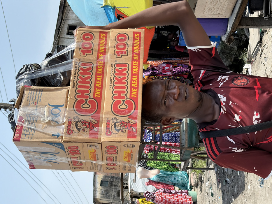 An adult male, dark-complexioned, is depicted in a frontal mid-shot in Jakande, Nigeria. He wears a maroon Manchester United t-shirt with white splatter patterns and black shoulder stripes, and a black shoulder strap is visible. His left eye is partially squinted, and he maintains a direct gaze towards the viewer. He is balancing a stack of five cardboard boxes on his head. The three visible lower boxes are branded "CHIKKI 100 INSTANT NOODLES," featuring a chicken mascot and "THE REAL TASTE OF NOODLES," with "Chicken Flavour" indicated. The uppermost box is partially obscured but displays "JOY" branding, with the entire load secured by clear plastic wrap and topped with black plastic bags. His left arm is raised, with the hand out of frame, in a gesture consistent with steadying the load. The immediate background features a market setting, with colorful patterned fabrics displayed on mannequins and racks to the left. To the right, a light blue plastic cooler rests on a wooden surface. Distant, weathered multi-story buildings and utility poles are visible under a clear, bright blue sky. The ground is unpaved, dusty, and contains debris.