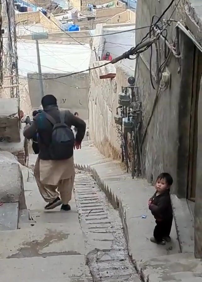 steep, narrow alleyway in a town or city. The alley is essentially a set of concrete steps going downhill between buildings, with a central drainage channel. Overhead are numerous power lines. A man wearing a backpack and traditional clothing walks down the steps. A small child in dark clothing stands near the side of the steps, appearing to observe the man. A second child can be seen briefly descending further down the steps. In the background, beyond the buildings lining the alley, lies a cityscape. The weather appears overcast.