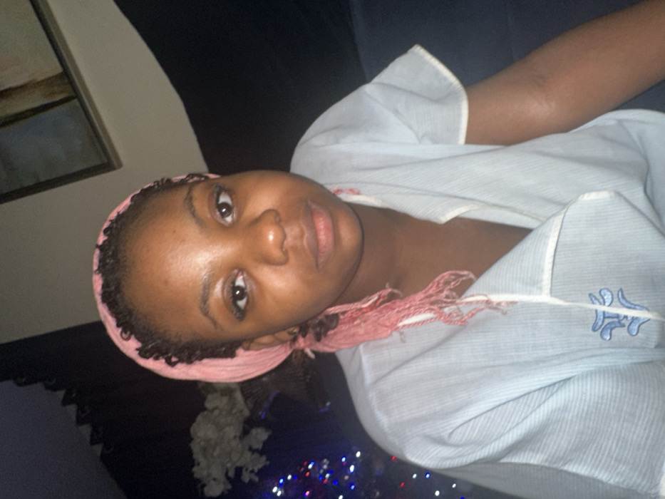 A woman with dark hair and skin is wearing a pink headscarf and a striped light blue shirt. Her gaze is directed towards the camera. A portion of her arm is visible in the upper right. Decorations with colorful lights are scattered near her. A blurry picture is seen on the wall with a dark backdrop.
