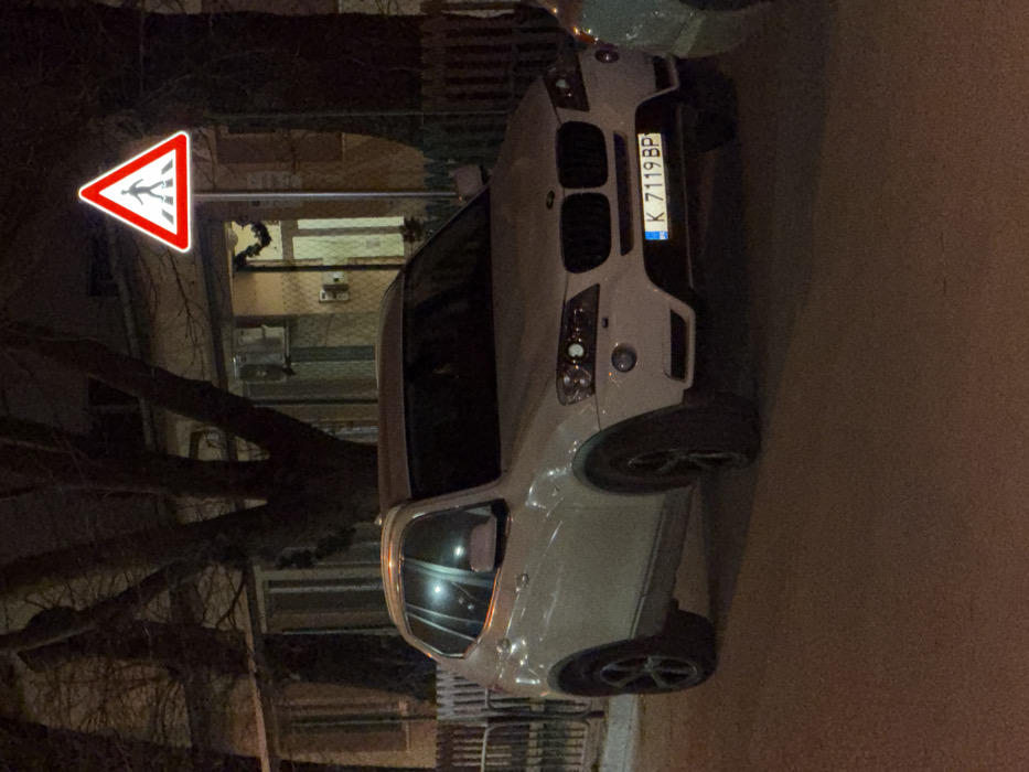 The image displays a nighttime urban scene in Stara Zagora, Bulgaria. A white BMW X3 sport utility vehicle (SUV) is parked on a paved street, angled towards the viewer, with its front facing slightly left. The vehicle exhibits a Bulgarian license plate, K 7119 BP. Behind the SUV, a light-colored building is partially visible, featuring multiple windows, an illuminated doorway with a decorative wreath, and an external air conditioning unit mounted on its facade. Bare deciduous trees are scattered throughout the background, partially obscuring the building. A low, white picket fence runs along the front of the building. A triangular warning sign, indicating a pedestrian crossing with a black pedestrian figure on a white striped background and a red border, is mounted on a pole to the right of the SUV, above its roofline. A portion of a second vehicle is discernible on the far right edge of the frame, partially behind the white BMW. No individuals are present in the image. The scene is illuminated by artificial light sources.
