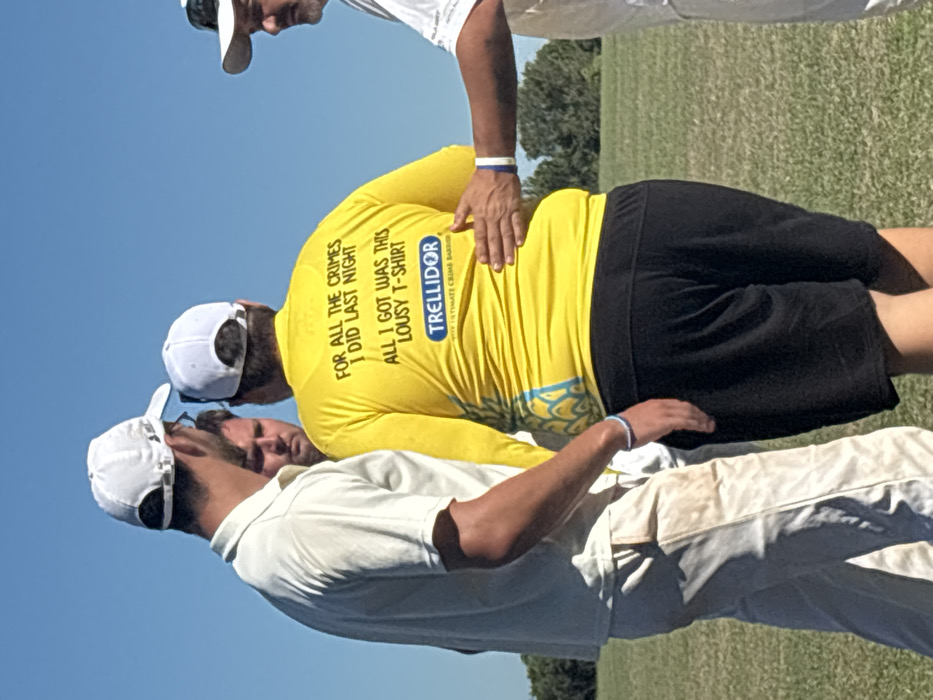 Four men are gathered on a grassy field in Port Alfred, South Africa, under a clear blue sky. The central figure, viewed from the back, wears a bright yellow long-sleeved shirt featuring the text "FOR ALL THE CRIMES I DID LAST NIGHT ALL I GOT WAS THIS LOUSY T-SHIRT" and a "TRELLIDOR" logo. He is also wearing black shorts and a white baseball cap. To his immediate left, a man in a white polo shirt, soiled light-colored long pants, and a white baseball cap stands with his left side visible; a blue and white wristband is on his left wrist. Between these two, a third man's face is partially visible. To the right, a fourth man, wearing a white shirt and a white baseball cap, has his left hand placed on the central figure's back, near the waistline, and also wears a blue and white wristband on his left wrist. Trees are visible in the distant background.