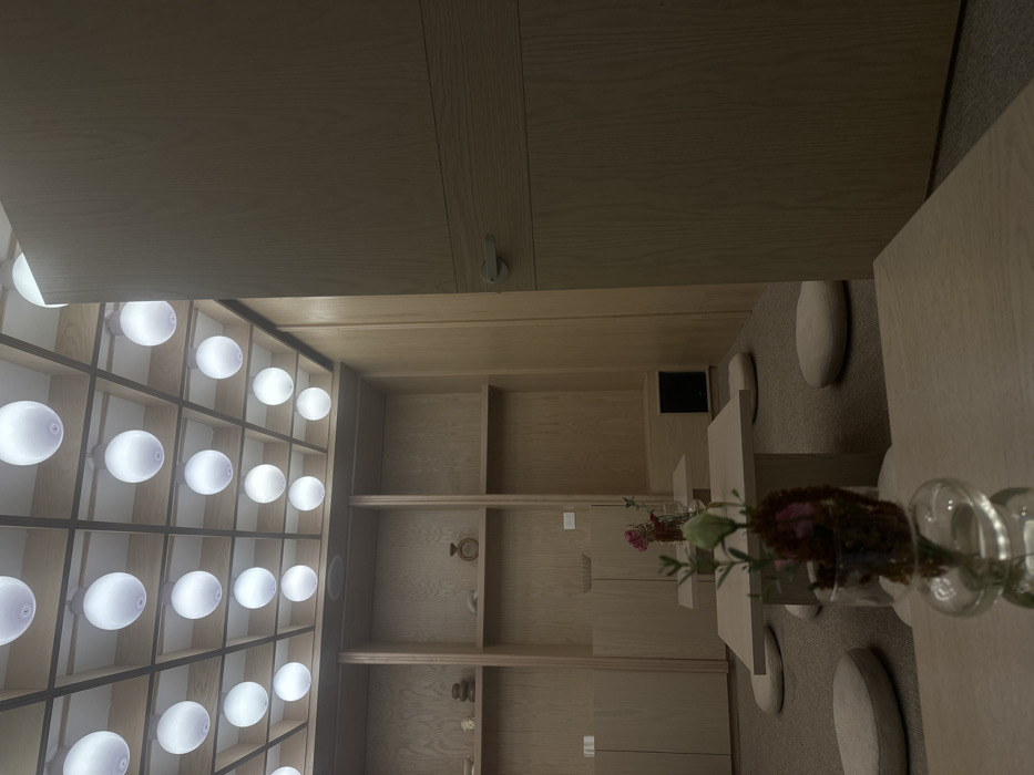 This image captures the interior of a minimalist establishment located in Puebla City, Mexico. The space features light-colored wood paneling on the walls and built-in shelving units. The ceiling displays a grid pattern containing at least 18 circular, frosted globe light fixtures that provide ambient illumination. The floor is covered with a light, neutral-toned carpet. In the foreground and mid-ground, multiple low, rectangular light-wood tables are arranged. Surrounding these tables are several round, flat, light-colored cushions serving as floor seating. The table closest to the viewer holds a clear glass vase containing a green plant arrangement. A table further back also has a vase with what appears to be pink and red flowers. The built-in shelving on the left wall contains decorative items, including a small white statuette, stacked stone-like objects, and a small terracotta-colored vase. Towards the lower right of the back wall, a dark, recessed opening is visible. A light-wood door with a silver-colored handle is partially open on the right side of the frame. No individuals are present within the scene.