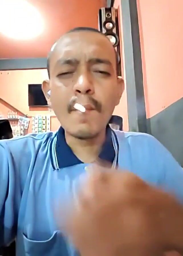 A man with short dark hair and a mustache, wearing a light blue polo shirt, is seen lighting a cigarette and smoking it indoors. He is sitting in what appears to be a small business or store, with a TV visible in the background and shelves stocked with various items. The lighting is bright and overhead. He takes a drag from the cigarette, exhales smoke, and gestures with his hand while talking.