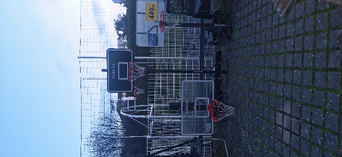 Three portable basketball hoops stand on a paved surface. Each features a rectangular backboard, a net, and a price tag. The first, sporting the brand name "TARMAK," is priced at 449.99. The basketball hoops are positioned near a fence. The sky is visible in the background.