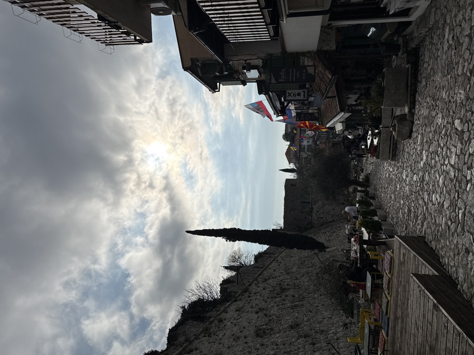 The image captures a cobblestone street in Stari Bar, Montenegro, descending between a massive stone fortress wall on the left and multi-story buildings on the right. The sky is partly cloudy, with the sun visible through a break in the clouds, casting a bright light. On the left, a tall, ancient stone wall, partially overgrown with ivy and shrubs, forms a barrier. A prominent, slender cypress tree stands tall near this wall, silhouetted against the sky. Further down the street, additional ancient stone structures of the fortress are visible in the mid-ground. On the right, buildings feature balconies with vertical railings and exposed air conditioning units. Several national flags, including those of Montenegro, Russia, and North Macedonia, are displayed from these structures, which host businesses such as "Kula Apartments, Restaurant, Cafe." Along the street, outdoor seating areas are established. On the left, a raised wooden platform with tables, yellow chairs, and patterned cushions is present, where several individuals are seated. Other tables are arranged along the right side of the street near the buildings, interspersed with potted plants. Multiple people are visible seated at these tables, while a few individuals are walking further down the cobblestone path. The scene conveys an active, historic urban setting.