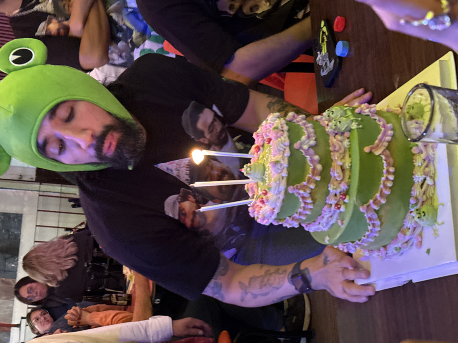 The image depicts an indoor scene in Mexico City, Mexico, centered on an adult male blowing out candles on a birthday cake. The man, positioned in the foreground, wears a bright green frog-shaped hat and a dark t-shirt featuring multiple printed photographic portraits of other males, one of whom is depicted wearing a party hat. He has a dark beard and visible tattoos on his left forearm. His mouth is slightly open, directing breath towards three lit white candles on the top tier of a three-tiered round cake. The cake is predominantly green, adorned with extensive pink and lighter green piped frosting resembling ruffles and garlands, small red decorative dots, and several small frog-shaped figurines. It rests on a white cake board placed on a dark wooden table. In the dimly lit background, several out-of-focus individuals are visible, seated at tables, consistent with a social gathering. To the left, a person in an orange top and two females are partially discernible. To the right of the cake, a dark smartphone with a case, a blue and a red bottle cap, and a glass (possibly a shot glass) are visible on the table, with a hand wearing jewelry partially obscuring the glass. The scene indicates a celebration, likely a birthday party.