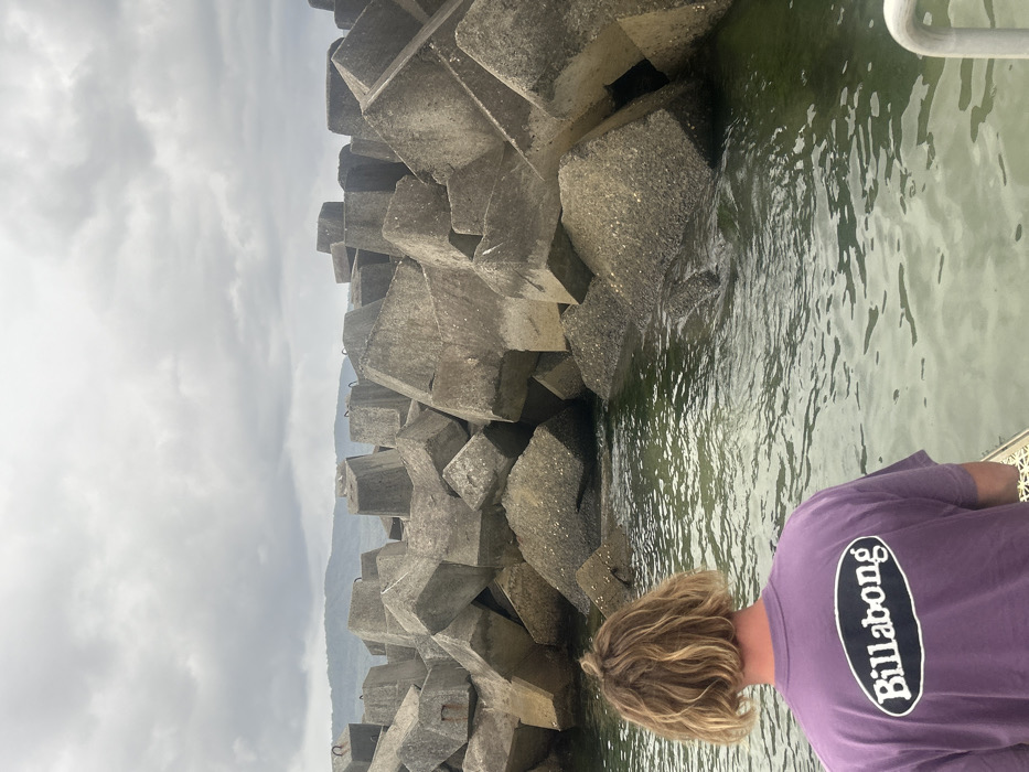 A man wearing a purple t-shirt with a "Billabong" logo stands near concrete tetrapods. These large, gray structures are stacked against the water's edge under a cloudy sky. The water appears somewhat green and reflective, suggesting it's not deep. The overall scene evokes a sense of coastal protection or harbor infrastructure.