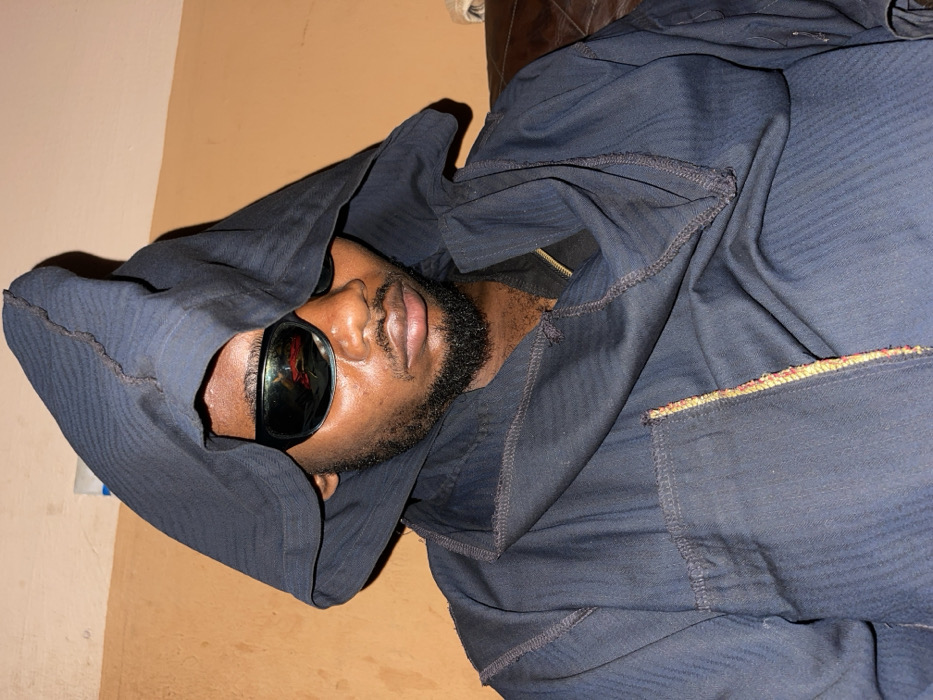 A man with dark skin and a beard wears dark sunglasses and a hooded blue jacket. He lies on his back, with the hood pulled over his head. The scene has a casual, relaxed mood. The background features a cream-colored wall. The angle of the picture makes the image look tilted.
