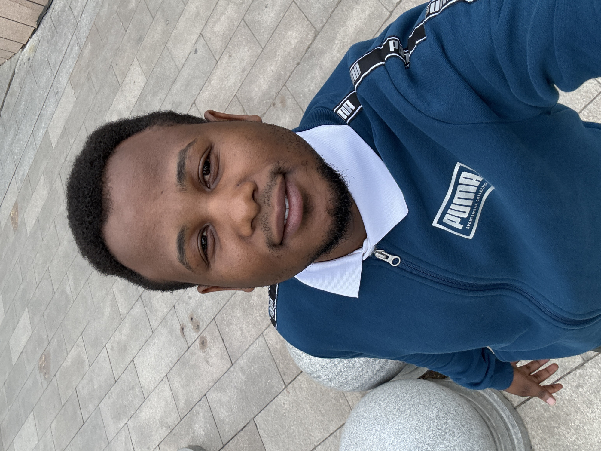 A man stands outdoors on a grey tiled surface, possibly a walkway or plaza. He is wearing a navy blue Puma zip-up jacket over a white collared shirt. The jacket has white trim with black Puma logos. He has dark hair, brown skin, and a trimmed beard. He appears to be holding the camera at an angle, taking a selfie. There are two grey, spherical concrete structures visible in the lower part of the frame. There is no information in the image to determine the location is in Daxing District, China.