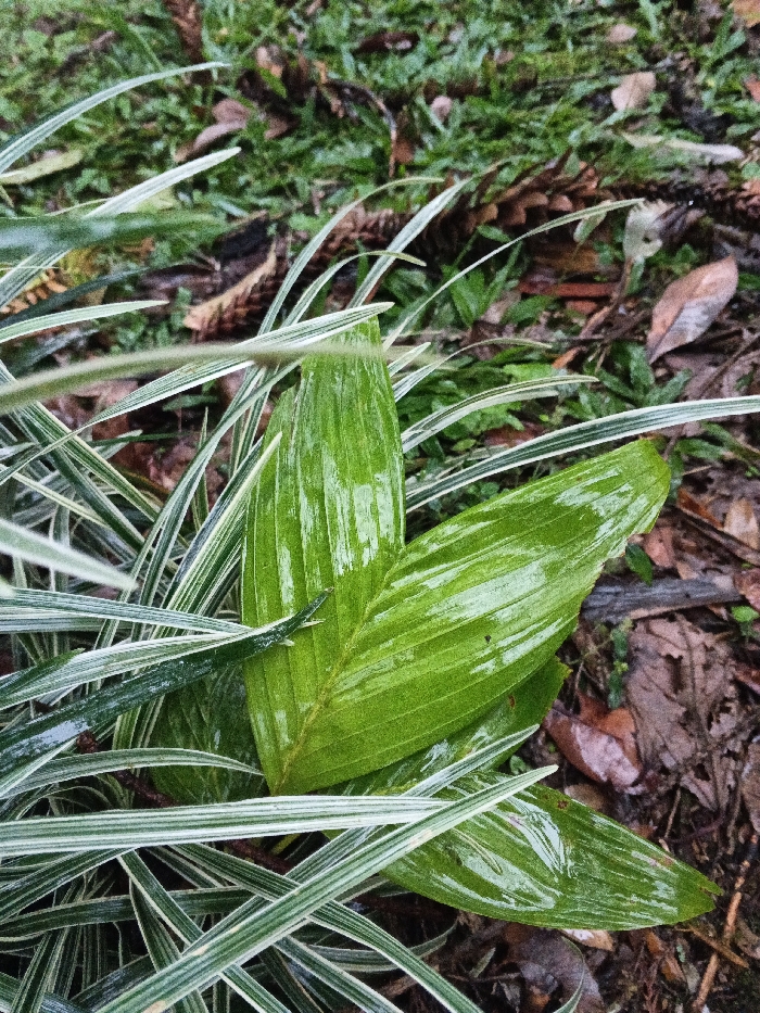 A close-up of a plant with long, slender leaves that are variegated with green and white. In the center are broad, shiny green leaves with prominent veins, possibly wet from rain. The plants are surrounded by damp earth, fallen leaves, and mossy ground cover. The overall impression is of a lush, verdant, and slightly overgrown garden setting.