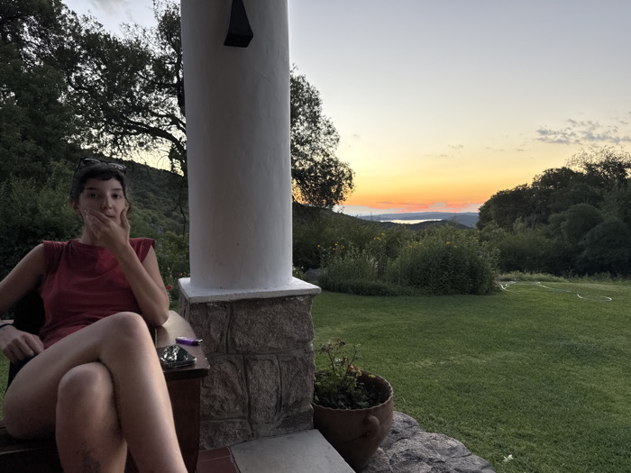A woman with short dark hair and sunglasses atop her head sits on a porch with her hand covering her mouth. She wears a reddish-brown shirt. Beside her sits an ashtray and lighter. In the background is a vibrant sunset over a body of water, framed by trees. A white column stands next to her chair, with a light fixture attached. The lawn stretches into the distance.