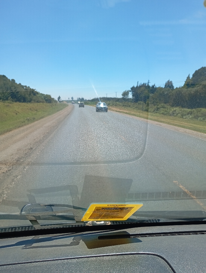 The image depicts a daytime scene from the interior of a vehicle traveling on an asphalt road in Kinale ward, Kenya. The foreground shows a dark grey dashboard and the base of a windshield, with a black wiper blade resting on the driver's side. A rectangular yellow sticker, identified as a "DIRECTLINE" document (likely an insurance or tax disc), is affixed to the lower passenger side of the windshield. The road, appearing to be a multi-lane highway, extends into the distance with a gentle curve. Three other vehicles are visible ahead, traveling in the same direction: a silver sedan in the mid-distance and two darker vehicles further beyond. Both sides of the road feature grassy shoulders transitioning into dense green vegetation and trees. The sky is clear and bright blue, indicating sunny weather. No people are visible.