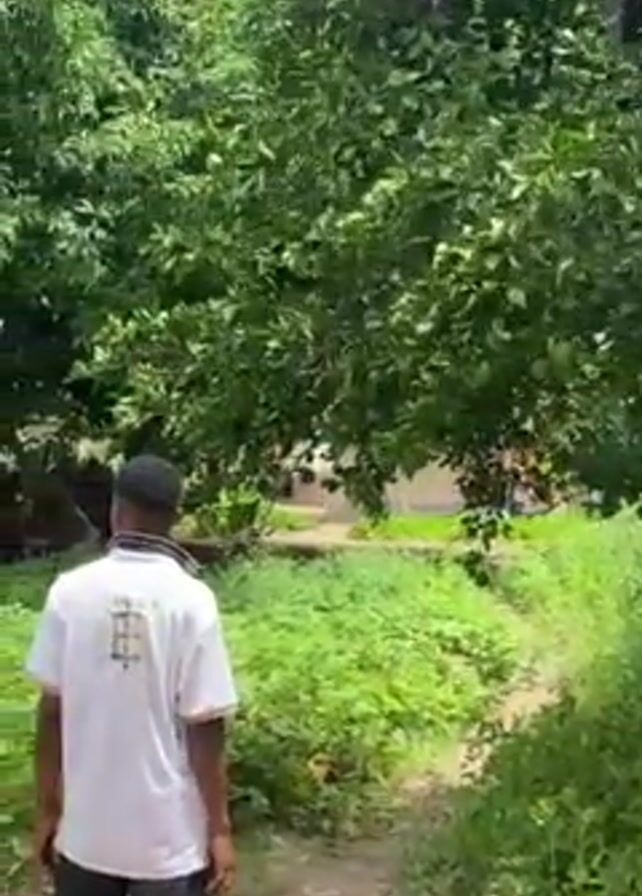 A man in a white shirt and dark shorts walks towards a large leafy tree. As he approaches, the camera tilts up to reveal a person high in the branches of the tree, apparently picking fruit. The surrounding area is lush and green, with grass and vegetation covering the ground. In the background, there's a glimpse of a building.