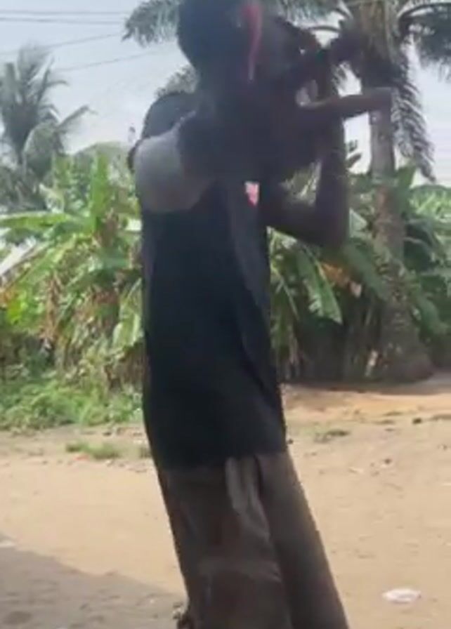 A young man dances in front of a palm tree in an outdoor environment. The man is wearing a black t-shirt and brown pants. He is gesturing with his hands as he moves. Behind him, there's a building, laundry line, and various trees and plants. The ground is a dirt road. The sky is overcast.