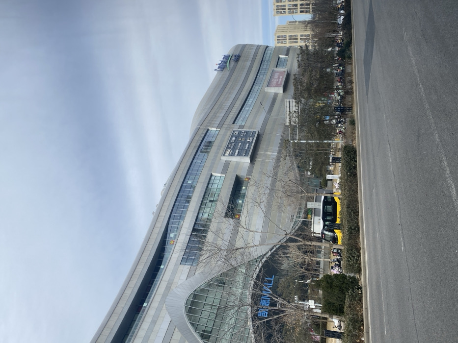 A tall, modern shopping mall with a curved facade stands adjacent to a road