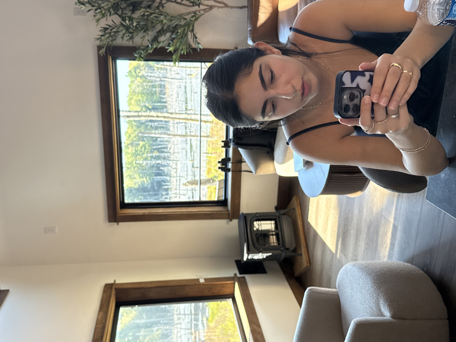 An indoor scene in Otego, United States, depicts a young adult female seated, intently focused on a dark-colored smartphone with a patterned case held in both hands