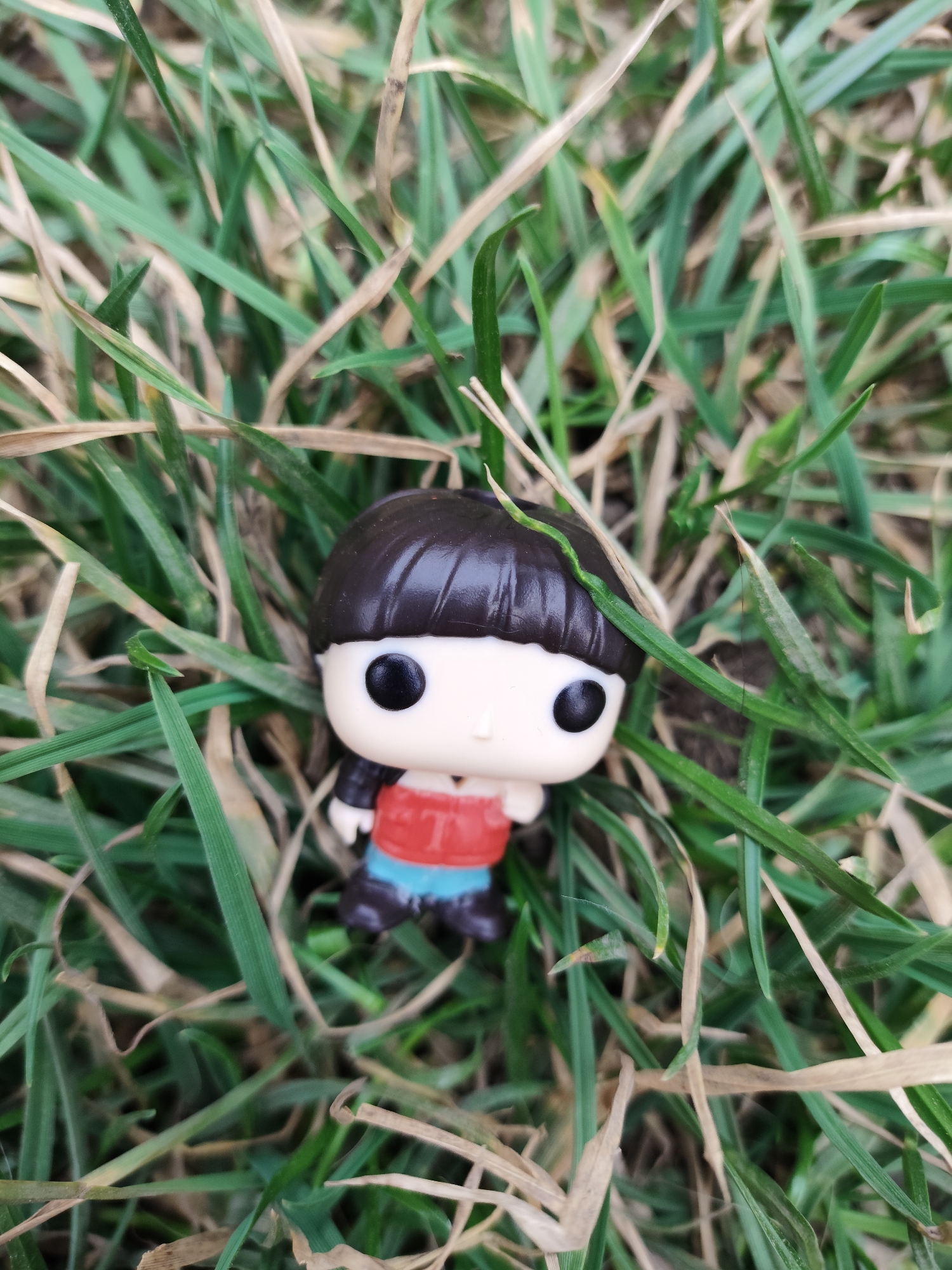 A Funko Pop figurine, resembling a child with a dark brown bowl cut hairstyle, is positioned in a patch of grass