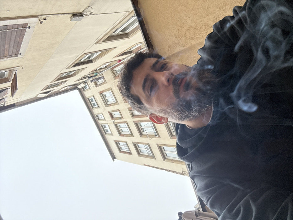 The image depicts an adult male with dark hair and a full beard, wearing a black hooded sweatshirt, looking directly towards the viewer from a low-angle perspective. Prominent plumes of smoke, consistent with exhalation, rise in front of his face and upper torso. The background reveals an urban environment with two light-colored, multi-story buildings converging to form a corner against an overcast, grey sky. These buildings feature multiple rectangular windows, some equipped with external metal railings and others with dark brown wooden shutters, some partially open. A warmer-toned wall is partially visible on the far right. The scene is located in Strasbourg, France.