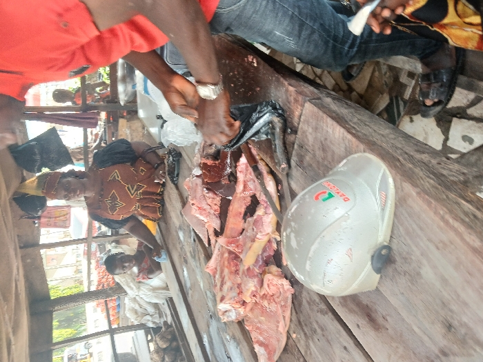 The image depicts a bustling market stall in Zango-ndaji, Nigeria. A large, worn wooden table, likely serving as a cutting and display surface, dominates the midground. Piled on this table are numerous cuts of raw meat, including muscle tissue and organ meat, notably dark liver-like pieces. A knife is visible amongst the meat. On the left side of the table, a light grey "DAYLONG" brand hard hat with a black side clip rests. In the right foreground, a male individual, partially visible from the torso down, wears an orange polo shirt, dark blue jeans, and black sandals. His hands are actively engaged in handling meat and manipulating a black plastic bag, suggesting packaging or preparation. To his left, several clear plastic bags are also present on the table. In the midground, behind the table, a woman wearing a brown patterned top with puff sleeves and a patterned headwrap stands, looking towards the foreground action. Partially visible behind her on the left is a child in a lighter-colored top. The background shows blurred market activity, including other people and what appears to be a street scene with a vehicle and additional market stalls or produce. The stall is covered by a simple roof structure, with hanging bags visible in the upper midground. The floor beneath the table appears to be tiled or paved with irregular grey and white stones.