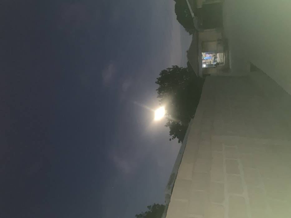 A nighttime scene reveals a bright light source, possibly the moon, shining through trees. The sky transitions from a deep blue to a lighter hue near the light. Part of a building, constructed with cinder blocks, extends into the frame on the right. A glimpse of an illuminated structure with activity visible inside is observed in the upper right. The scene is somewhat grainy, suggesting a low-light or mobile phone capture.
