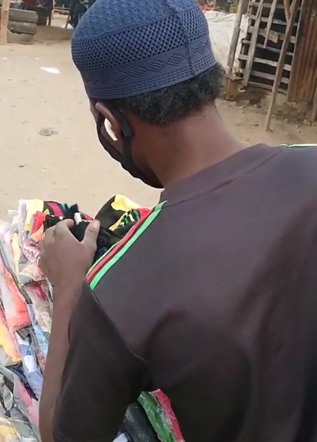 person from the back, examining socks on a display table at an outdoor market. The person is wearing a dark blue kufi cap, a black face mask, and a black t-shirt with green, yellow, and red stripes on the shoulder. The socks on the table are in a variety of colors and patterns, many of them packaged in clear plastic. The market setting has other stalls and people visible in the background. A motorcycle and construction materials are also visible. The ground appears to be dirt.