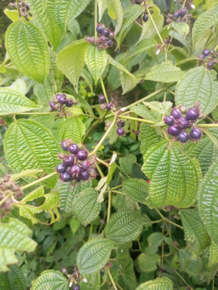 The image displays a close-up of a plant featuring vibrant green, ovate leaves with prominent parallel venation and a textured, slightly corrugated surface, located in Bamhori, India. Clusters of small, spherical to ovoid, dark purple berries are visible along the plant's green, slender, and visibly hirsute stems. Berries range from individual specimens to denser clumps. The background is composed of out-of-focus green foliage, indicating a natural, densely vegetated environment. No individuals, animals, or man-made structures are present within the frame.