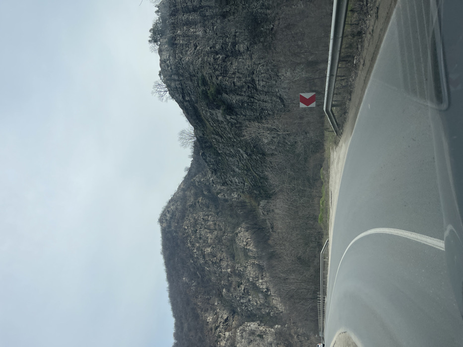 The image displays a two-lane asphalt road curving to the left through a mountainous landscape in the area of Dorkovo, Bulgaria. The road surface exhibits a continuous white centerline. A metal guardrail extends along the right shoulder of the road, behind which a red and white chevron sign, indicating a sharp left curve, is positioned. The environment features steep, rocky mountainsides with exposed grey rock formations, partially covered by a dense growth of leafless deciduous trees and shrubs, suggesting a late winter or early spring season. The sky is uniformly overcast and light grey. A light-colored vehicle is partially visible in the distance on the left side of the road, heading towards the curve. The perspective indicates the photograph was taken from inside a vehicle.