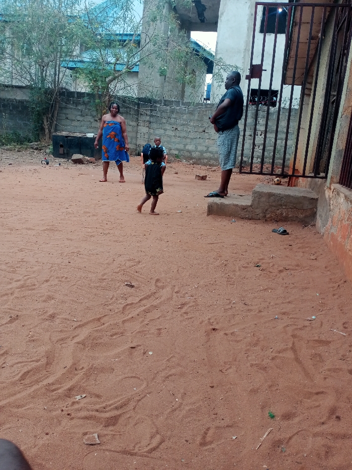 In an outdoor area with red sand, a woman in a blue patterned cloth stands near a black container. A small child in a dark dress walks forward. A man in a black shirt and grey shorts stands on concrete steps near a metal gate. Another child sits on something low to the ground behind the first child. Buildings and a grey brick wall form the backdrop.