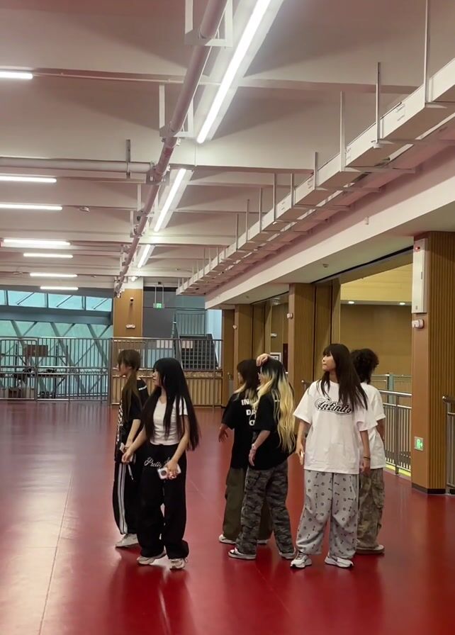 group of seven young people, mostly female-presenting, standing in a line on a red floor. They are in an indoor space with a white ceiling lined with long light fixtures. The background features a large window and wooden wall paneling. Most of the individuals are wearing casual clothing such as t-shirts and loose pants or cargo pants, some with graphic designs. They are looking towards something out of frame. The overall impression is that they are waiting or preparing for something.