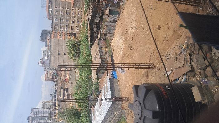 This image depicts an elevated view of a mixed urban and informal settlement area within Nairobi, Kenya, under a partially cloudy sky. In the immediate foreground, a black, cylindrical "Technitank" brand plastic water storage tank rests on stacked concrete blocks. To its right, a pile of construction debris, including concrete rubble, wooden boards, and discarded plastic, is visible. A dark-colored garment with a green clothespin hangs on a thin, dark line extending horizontally across the lower right frame. The midground features a barren, tan-colored dirt plot, indicative of a construction site. Two prominent vertical structures composed of exposed reinforcing bars (rebar) stand erect from this plot, suggesting the initiation of building columns. To the left of the rebar structures, a single-story building with a corrugated metal roof and unrendered block walls is present. To the right and extending further back, an extensive informal settlement is visible, characterized by numerous shanties constructed from corrugated metal sheets and various scrap materials, some exhibiting blue paint. Green foliage and small trees are interspersed among these structures and the general landscape. The background reveals a dense urban skyline. Multiple multi-story buildings, predominantly constructed from concrete, are visible. Some appear to be completed residential or commercial structures, while others show signs of ongoing construction with exposed frames or scaffolding. No individuals are visible, and no specific actions or interactions are depicted in the scene. The lighting suggests daytime conditions.