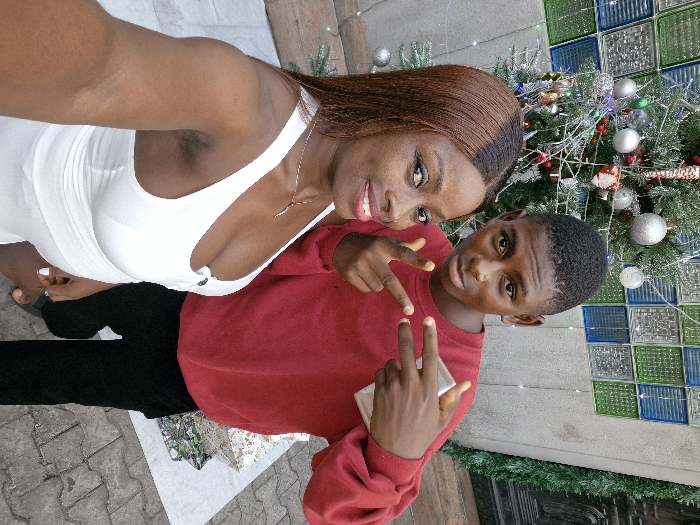 A selfie-style photograph depicts two individuals, a female and a male, outdoors in Ilado, Nigeria. The female, an adult with dark skin and long brown hair, wears a white sleeveless top and a silver necklace, smiling directly at the camera. Her left arm is extended, holding the camera. The male, a younger individual with dark skin and short dark hair, stands slightly behind and to her right. He wears a red long-sleeved shirt and black trousers. His left hand is raised, fingers forming a "peace" sign, while his right hand holds a white smartphone and forms a similar gesture. He looks towards the camera with a neutral expression. Behind the individuals, a decorated artificial Christmas tree with silver baubles, red ornaments, and string lights is visible. To the right of the tree, at its base, two wrapped gift boxes are stacked on a white surface. The background features a building wall; the upper section displays square glass blocks, some clear, some greenish-blue. A vertical green garland is present on the far right, adjacent to what appears to be a dark door. The ground is paved with grey interlocking concrete pavers.