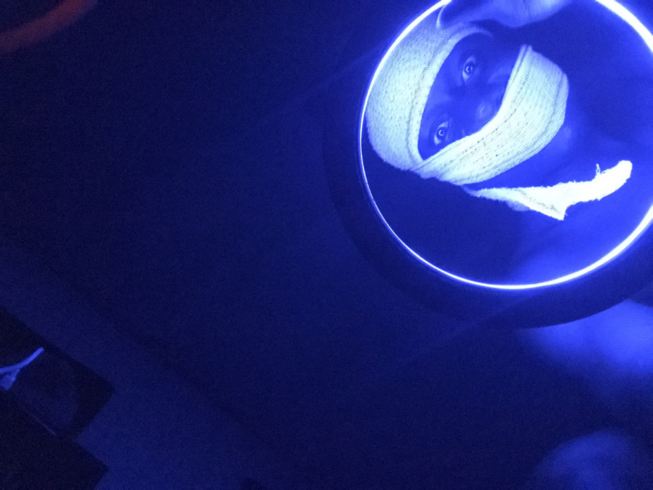 A person's face is illuminated by a blue light emanating from a ring. A white bandage wraps around their head, obscuring most of their face except for their eyes. The person is positioned at an angle, with a dark, shadowy background filling most of the frame. The lighting creates a surreal and eerie mood.