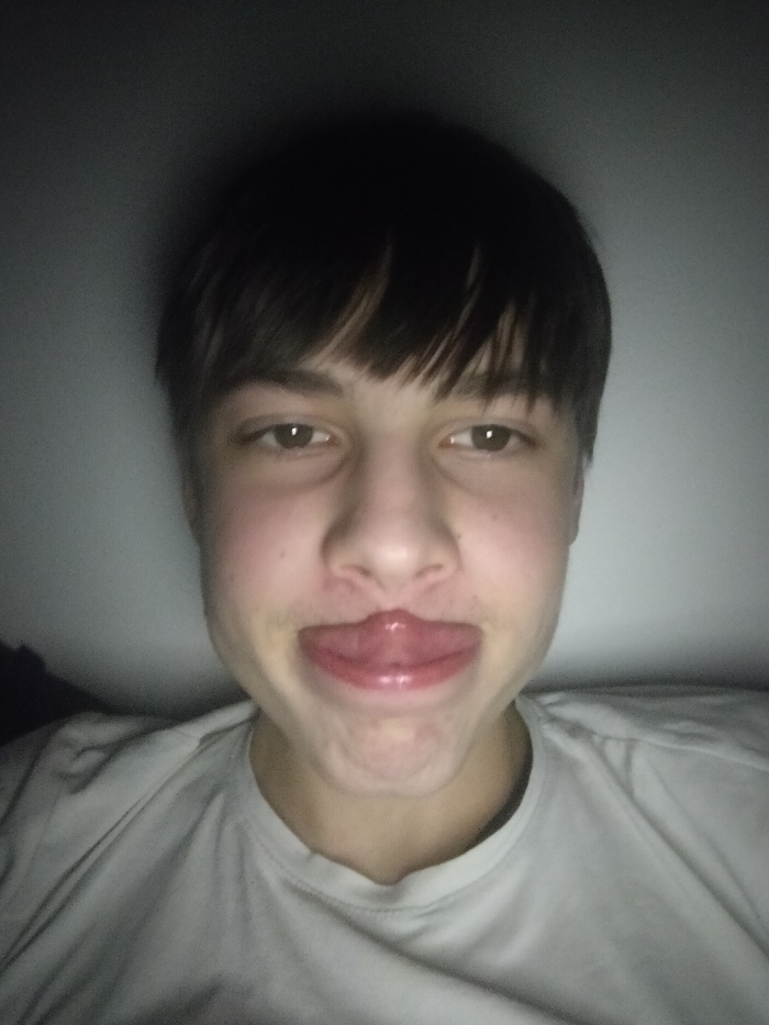 A young person faces the camera with a distorted mouth. Their lips appear unnaturally large and swollen, possibly due to an allergic reaction or a filter effect. They have short brown hair with bangs and are wearing a white t-shirt. The lighting is dim, casting shadows on the upper part of their face. The background is a blurry, pale wall.
