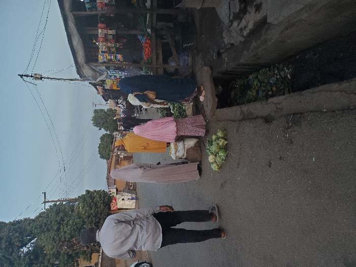 A street scene depicts several people, likely vendors, near a roadside stall. Some are wearing clothing that covers much of the body, like abayas, in shades of navy blue, pink, and mustard. Piles of produce, possibly cabbages, sit near the vendors. A man in light-colored clothing and black pants walks along the road. An open drain runs alongside the stall. Power lines and poles stretch above. The scene is captured during daylight hours, likely in a market setting.