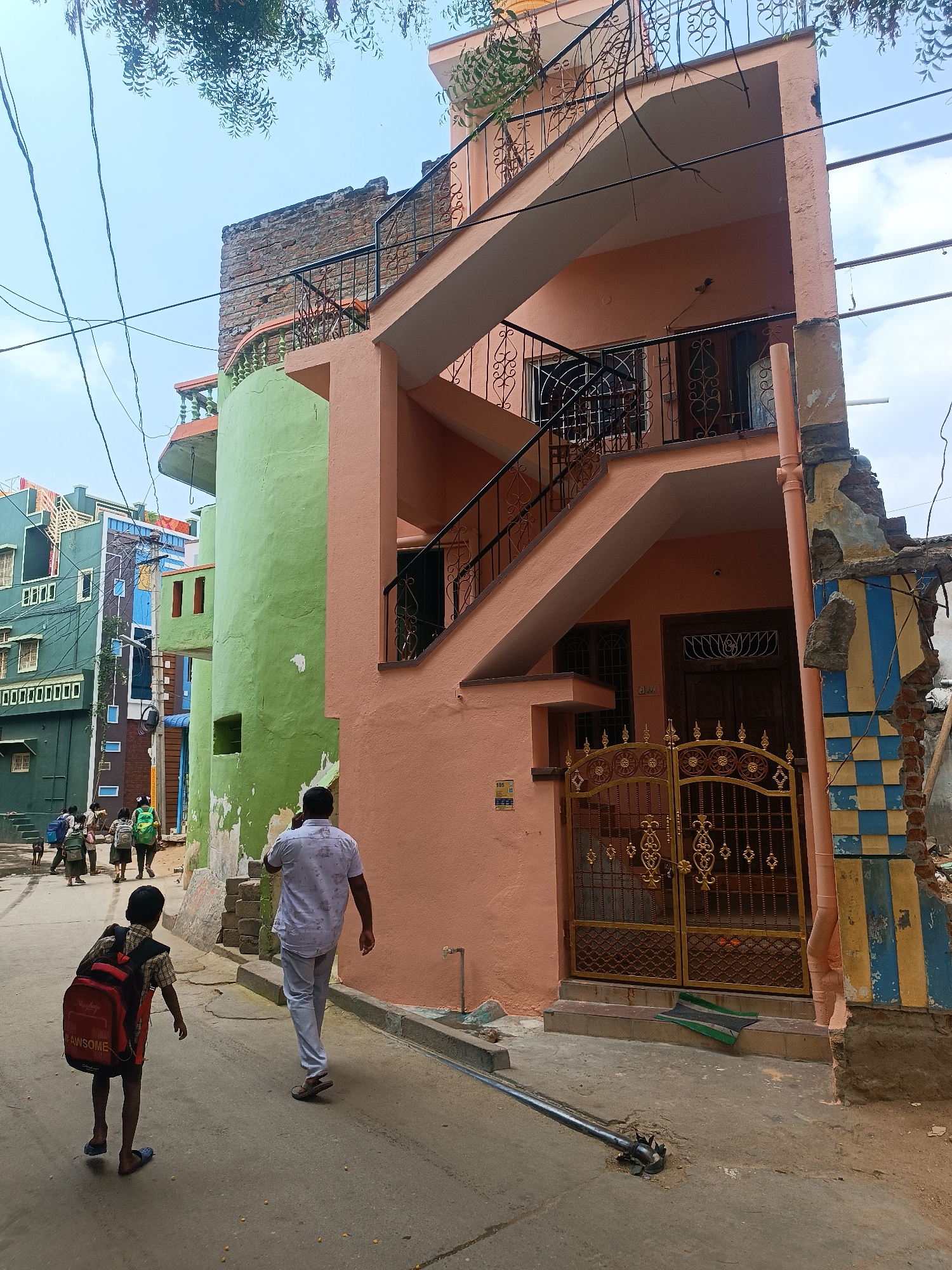 The image depicts a residential street scene in Pedda Kammavaripalli, India, under a light blue sky with scattered white clouds and visible tree foliage at the top. In the immediate foreground, a young boy wearing a plaid shirt, shorts, and blue flip-flops walks away from the camera, carrying a red backpack with "AWESOME" visible on it. Ahead of him, an adult male in a white patterned shirt and light-colored pants walks in the same direction, speaking on a mobile phone held to his right ear. The concrete road surface shows scattered light-colored debris and a black metal pipe or bar lying near the right curb. To the right, a prominent multi-story building, painted peach, features an external staircase with black metal railings leading to its upper floors. The ground floor entrance includes an ornate golden metal gate with intricate patterns, behind which a recessed brown wooden door and a green and black striped doormat are visible. Windows with security grates are present on the ground and upper levels. A light orange downspout runs vertically along the right edge of this building. Immediately to its right, a significantly damaged wall section reveals exposed brickwork and patches of blue and yellow checkered tiles. In the midground, to the left of the peach building, stands a bright green building with a curved facade and small, rectangular window openings, showing signs of peeling paint. Further down the street, a group of children, several carrying backpacks, are visible walking away from the viewer. Other colorful residential structures, including a teal-colored building with multiple windows, line the street in the background. Numerous tangled black electrical wires crisscross the sky overhead.