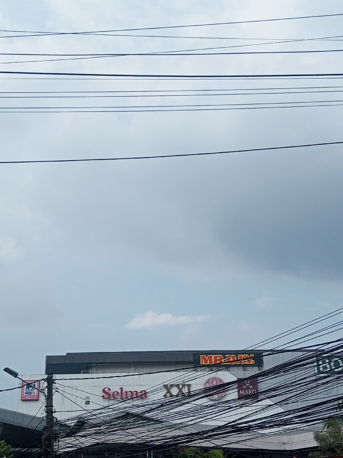 An exterior shot shows a multi-tenant building under a cloudy sky, obscured by numerous power lines. Prominent signage includes "MR.DIY," "Selma," and "XXI." A smaller sign reads "MAKO." "INDO" is also visible on another sign. The building appears to be a retail complex. A streetlight is present, along with green foliage at the bottom of the frame.