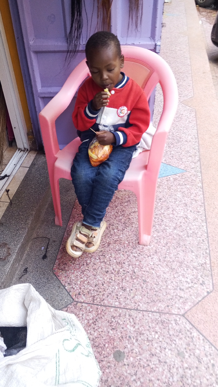 - "A young child, approximately 3-6 years old, is seated on a pink plastic chair on a patterned terrazzo sidewalk in a commercial area of Nairobi, Kenya" by FM-hTtyx1, licensed under CC BY 4.0