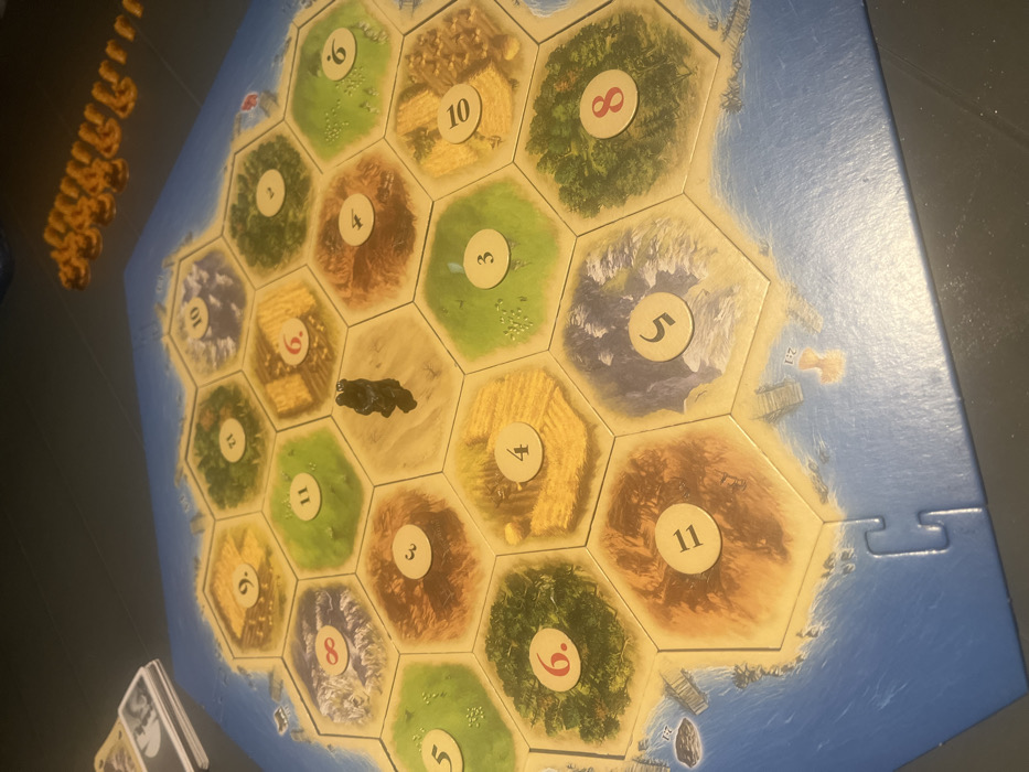 A Catan board game is set up on a dark surface, featuring resource hexes and number tokens