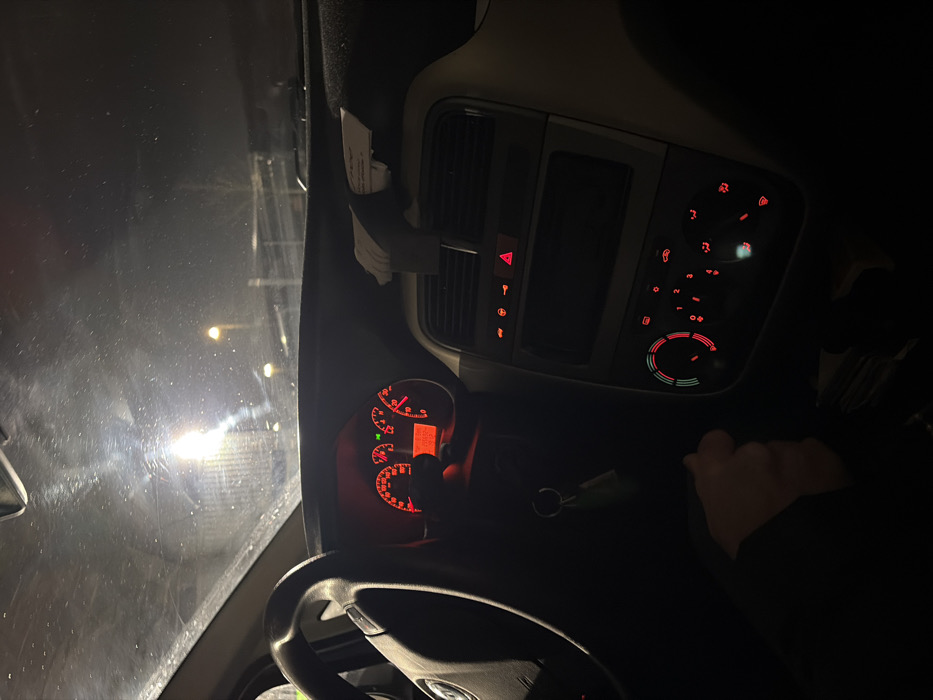 A dimly lit car interior shows a steering wheel, dashboard with illuminated gauges and control panels