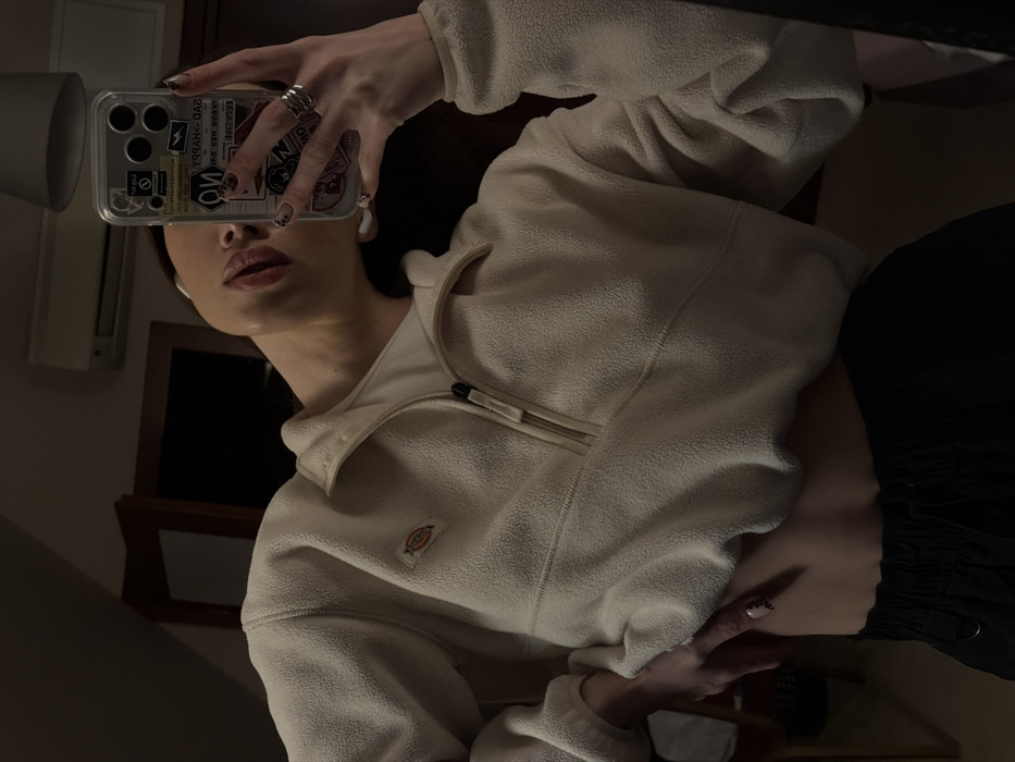 An individual is depicted taking a mirror selfie indoors under dim lighting conditions. The subject, likely female, is partially visible from the chest upwards, including the neck, chin, and lips, and an arm holding a smartphone. They are wearing a cream-colored fleece pullover with a quarter-zip neck, featuring a small "Dickies" logo patch on the left chest. A white undershirt is visible beneath the fleece. The lower edge of the fleece is above the waist, exposing a portion of the midriff. Black bottoms, appearing to be cargo-style pants or shorts with an elastic waistband, are visible at the bottom of the frame. The subject holds an iPhone with a clear case covered in various stickers, including "SAD HAPPY," "NO," "VIBE CHECK," and "ERROR 404." Multiple silver rings adorn the fingers of the hand holding the phone. White wireless earbuds are present in both ears. The subject's head is tilted backward and slightly to the right. The visible nails are manicured with a patterned design. The background shows an interior room, possibly a hotel or apartment. A white air conditioning unit is mounted high on a wall. A dark wooden door frame or partially open door is visible. A dark, possibly cylindrical, light fixture hangs from the ceiling. The walls are a neutral, light color, appearing subdued due to the low light. No specific visual cues in the image definitively indicate the city of Gdańsk, Poland.