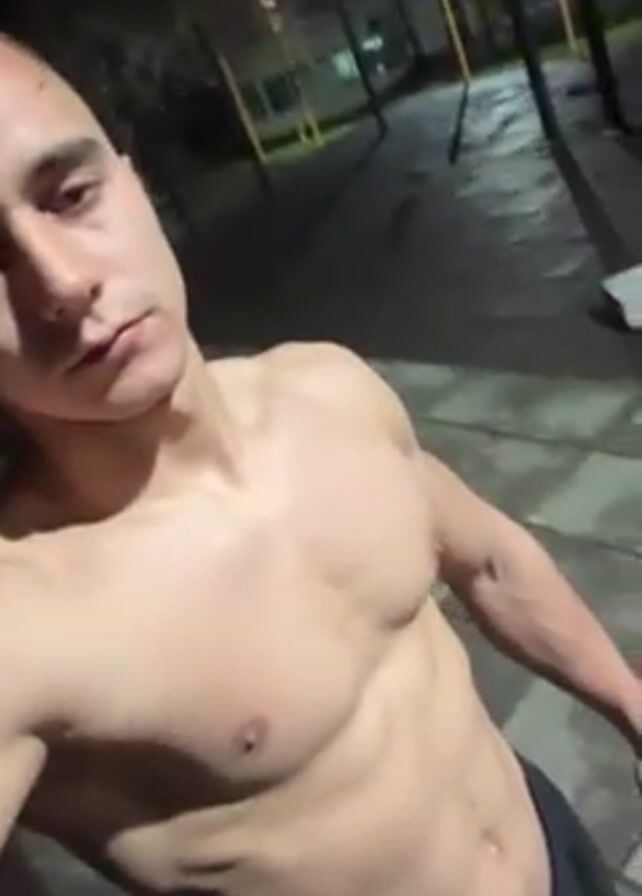 shirtless man standing outside in what appears to be a park or outdoor workout area at night. The area is illuminated by overhead lights. The camera is held close to the man, focusing on his upper torso, highlighting his muscular build. He appears to be recording himself. The background includes pavement with a tiled pattern and some equipment, possibly for exercise. The man remains mostly still during the short video clip.