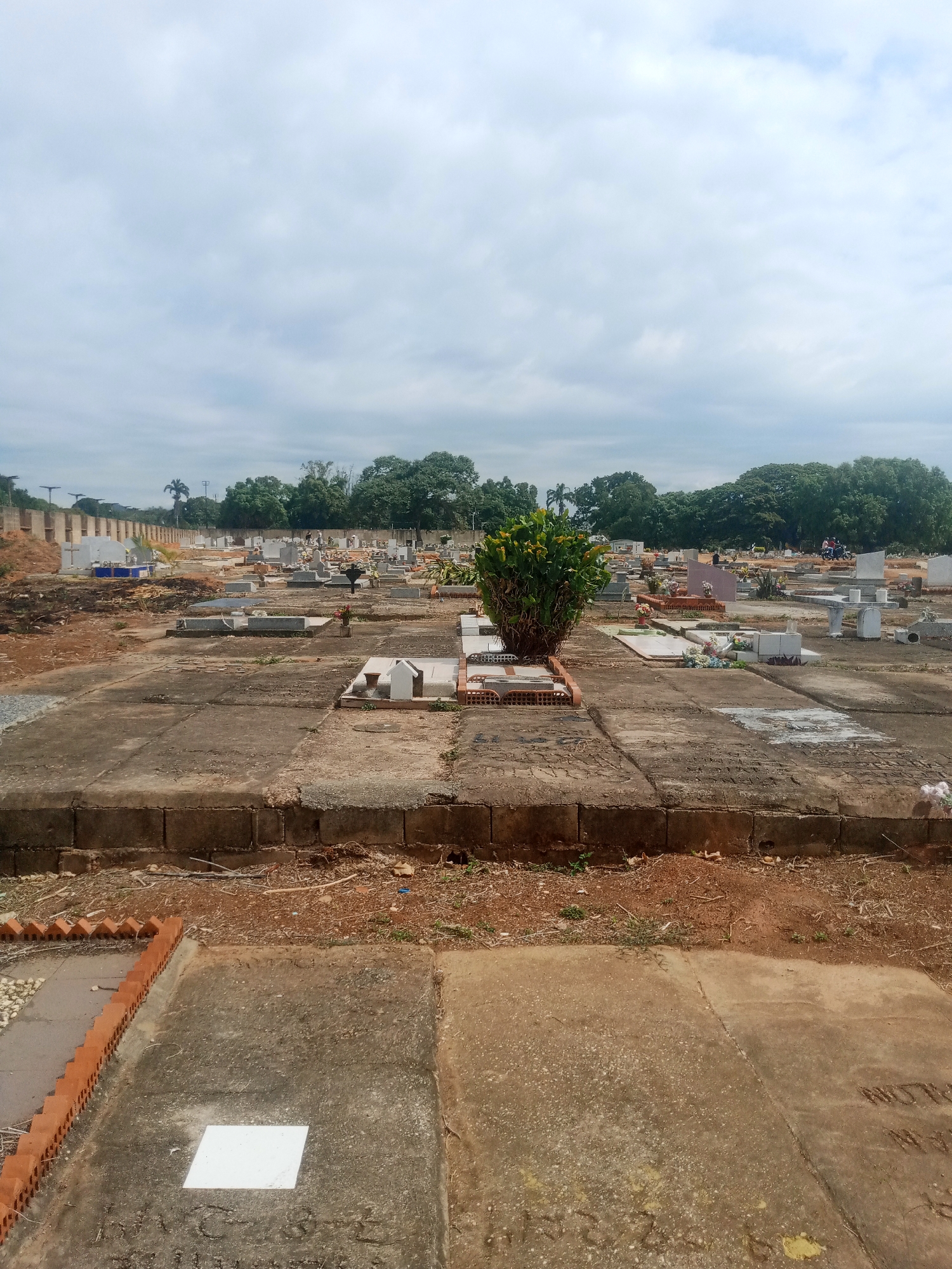 cemetery in Tinaquillo, Venezuela. The scene consists of numerous gravestones and tombs scattered across a largely open area. Many of the graves are constructed of concrete, with some featuring brick or tiled borders. Vegetation is present in the form of trees in the background and a large bush in the foreground, along with smaller plants among the graves. The ground is mostly dirt and bare earth, with some concrete or tiled pathways. The sky is overcast with a layer of clouds. Some of the tombs have small structures or decorative elements, but overall the cemetery appears somewhat weathered and possibly not recently maintained.