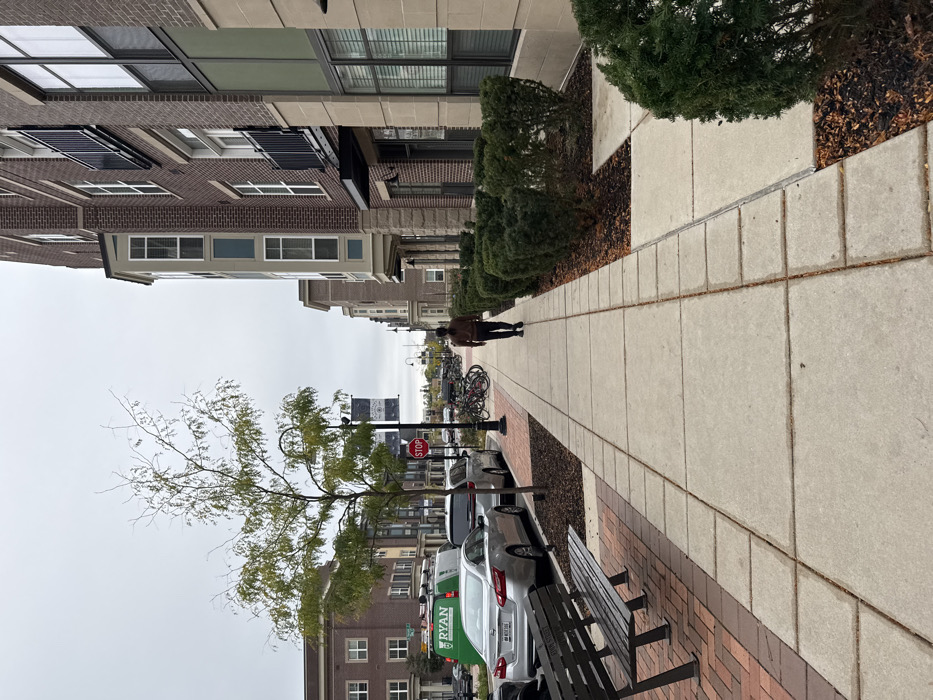This image captures an urban street scene in South Bend, United States, specifically on Green Street, indicated by signage on a park bench. The setting is a cloudy day, characterized by an overcast, light gray sky. In the foreground, a black metal park bench is positioned on a red brick paver section of the sidewalk on the left. The bench's backrest has "GREEN STREET" and "SOUTH BEND" carved into it. To the right of the bench, the sidewalk transitions to light gray concrete, extending into the background. A single individual, wearing a dark brown long-sleeved top and dark pants, walks away from the viewer along the concrete sidewalk, heading towards the background. The person's hair appears dark, possibly tied back. To the left of the sidewalk, a young tree with sparse green foliage and some bare branches is planted in a mulched area. Beyond the tree, a street runs parallel to the sidewalk. Parked along this street are several vehicles: a silver sedan with a partially visible license plate ("M 088"), a silver minivan or SUV, and a green utility van with "RYAN" printed in white on its side. Further down the street, multiple bicycles are parked together. A red hexagonal "STOP" sign is visible on a pole near the parked vehicles. On the right side of the sidewalk, a series of manicured green hedges are planted in mulched beds, separating the pedestrian path from a multi-story building. This building is constructed of reddish-brown brick with light-colored stone accents on the ground floor. It features numerous windows, some with dark frames, and bay windows extending outwards. Black metal railings are visible on some balconies. Other multi-story brick buildings, consistent in style, extend into the background on both sides of the street. Black lampposts with banners, one clearly displaying "SOUTH BEND," line the street. The scene is illuminated by natural, diffused light, indicating an absence of direct sunlight and strong shadows.